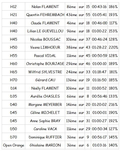 Côté Résultat, Félicitation à Dominique qui obtient son premier podium de la saison avec une troisième place. Claude lui fini au pied du podium mais il faut rappeler qu’il y a avait trois monstres de la CO devant lui. A noter également en Open le podium pour Ghislaine M qui continue son apprentissage de la CO. Des bons chronos pour Nicolas B, Pascal, Caroline et Aurélie qui termine à moins de 33% de plus que le temps de gagne.